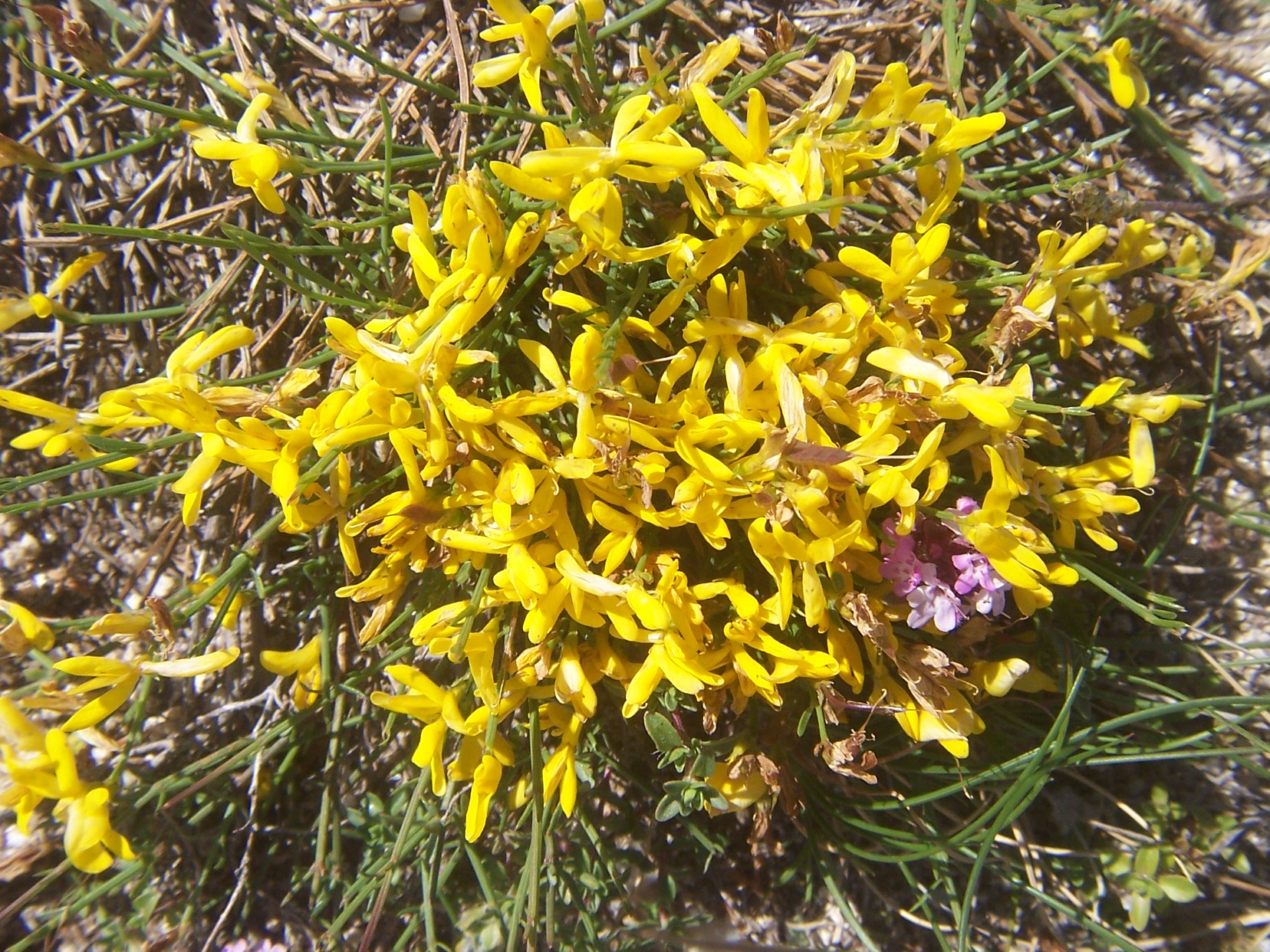 FIORI - sono raccolti in brevi racemi pedicellati e fogliosi, con una lunghezza variabile , con bratteole rossastre con calice liscio, colla gialla con un vessillo di 10mm o 12mm , con molti stami più bassi dello stimma. Fioritura: aprile - maggio